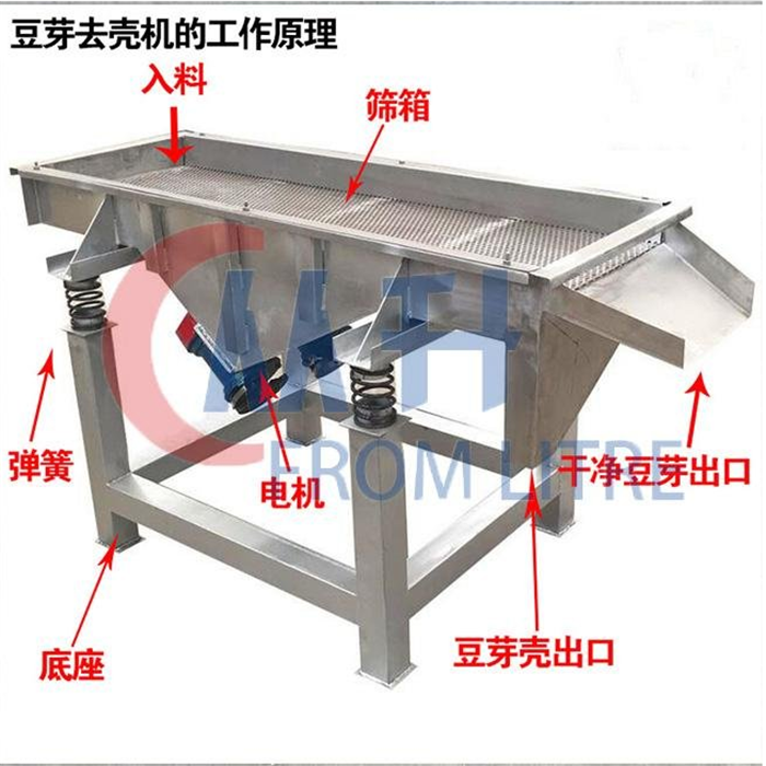 新型豆芽篩、豆芽振動分離篩、家用式小型豆芽篩、豆芽脫殼篩主要由篩箱、篩框、篩網(wǎng)、振動電機、減振彈簧、等組成。