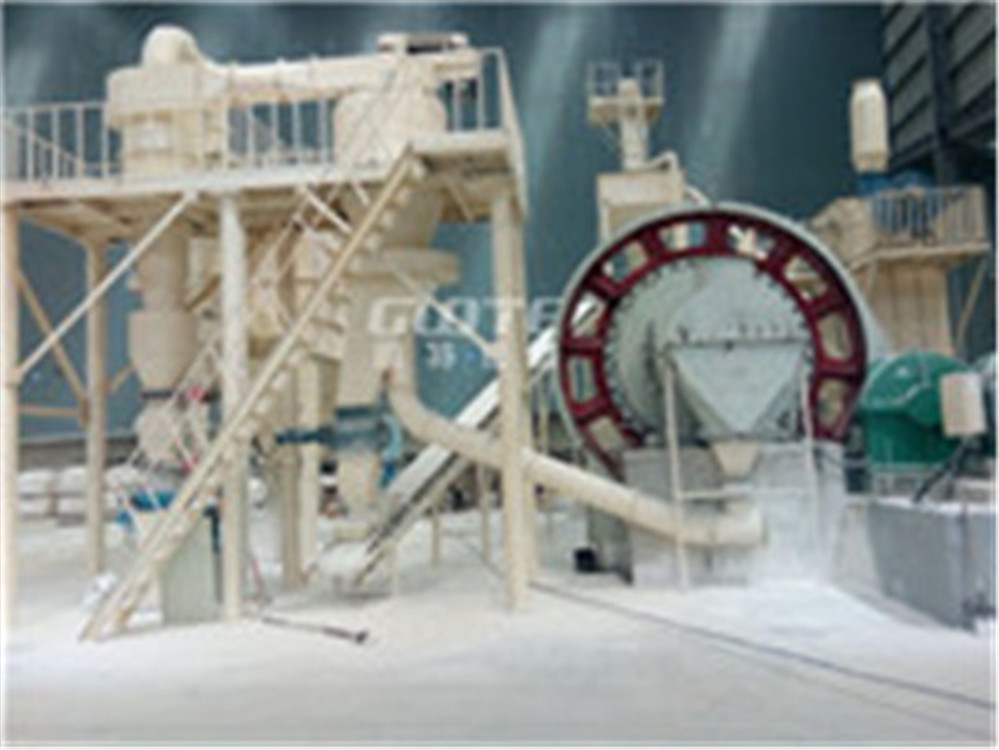 小于-10目的原料,由進(jìn)料裝置經(jīng)入料中空軸螺旋均勻地進(jìn)入磨機(jī)倉,倉內(nèi)設(shè)有陶瓷襯板,內(nèi)裝不同規(guī)格鋼玉球,筒體轉(zhuǎn)動(dòng)產(chǎn)生離心力將介質(zhì)球帶到一定高度后落下,對(duì)物料產(chǎn)生沖擊和研磨作用。達(dá)到要求的粉狀物通過卸料箅板排出,完成粉磨作業(yè)。粉磨后的物料由入料口進(jìn)入分級(jí)機(jī),通過調(diào)節(jié)分級(jí)輪(變頻控制,無級(jí)調(diào)速)的轉(zhuǎn)速,并配以合理的二次進(jìn)風(fēng),在分級(jí)區(qū)內(nèi)形成合理穩(wěn)定的氣固兩相流,利用分級(jí)輪旋轉(zhuǎn)產(chǎn)生離心力,和引風(fēng)機(jī)負(fù)壓產(chǎn)生吸引力的相互作用,實(shí)現(xiàn)對(duì)物料的有效分級(jí)。粗顆粒由粗料返回裝置返回球磨機(jī)繼續(xù)研磨,成品則由自動(dòng)包裝機(jī)完成打包作業(yè)。整個(gè)系統(tǒng)配有除塵器,采用較先進(jìn)的電磁脈沖自動(dòng)清灰,攜帶粉塵的氣體進(jìn)入除塵器后,粉塵被濾袋過濾,附著在濾袋外表面的粉塵在脈沖反吹氣體的作用下散落在底部被收集,經(jīng)過過濾后的潔凈氣體通過風(fēng)機(jī)排入大氣。