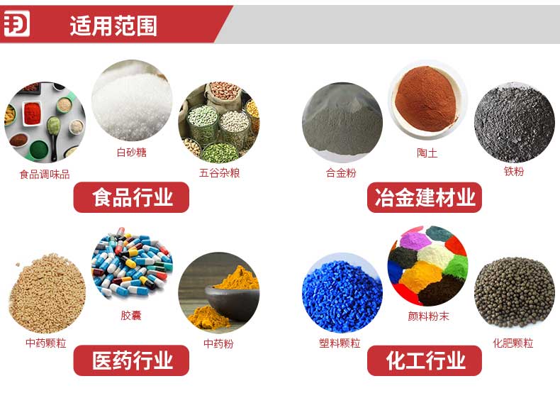 化工行業(yè):樹脂粉、顏料、洗衣粉、微粉、油漆、純堿、檸檬粉、橡膠、塑料等。