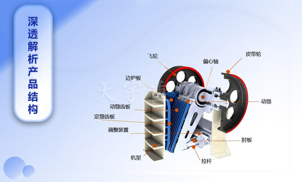電動機(jī)驅(qū)動皮帶和皮帶輪,通過偏心軸使動顎上下運(yùn)動,當(dāng)動顎上升時肘板和動顎間夾角變大,從而推動動顎板向定顎板靠近,此時被破碎的物料被擠壓、搓、碾等多重受力而被破碎。當(dāng)動顎下行的時候,肘板和動顎的夾角變小,動顎板在拉桿、彈簧的作用下與定顎板的間距拉大,此時被破碎的物料從破碎腔出抖口排出,隨著偏心軸的連續(xù)運(yùn)轉(zhuǎn),動顎作周期性的往復(fù)運(yùn)動,進(jìn)入破碎腔的物料不斷地被破碎、排出,實現(xiàn)連續(xù)生產(chǎn)。