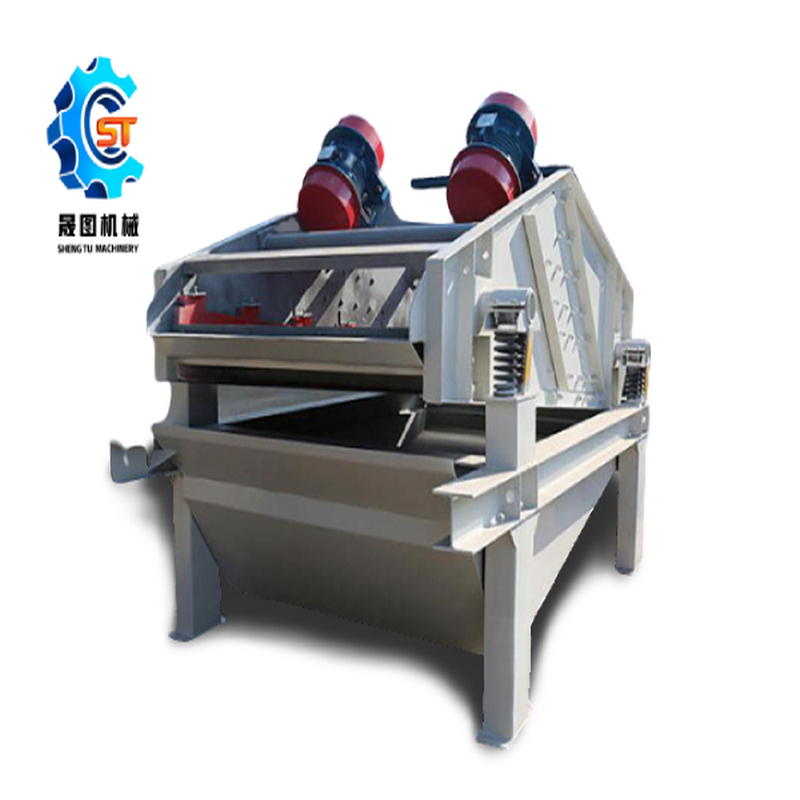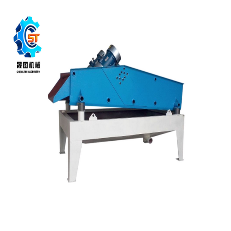 直線脫水篩采用了雙電機自同步技術(shù),通用型偏心塊、可調(diào)振幅振動器。主要由篩箱、激振器、支承系統(tǒng)及電機組成。兩個互不聯(lián)系的振動器作同步反向運轉(zhuǎn),兩組偏心質(zhì)量產(chǎn)生的離心力沿振動方向的分力疊加,反向離心抵消,從而形成單一的沿振動方向的激振動,使篩箱做作往復(fù)直線運動。主要作用是脫水、脫泥、脫介,可用于砂石料廠水洗砂、選煤廠煤泥回收、選礦廠尾礦干排等,因此也叫振動脫水篩、礦用脫水篩、煤泥脫水篩、尾礦脫水篩、高頻脫水篩等。直線脫水篩作用于某些含泥量低的物料時也可單使用,不需要洗砂機,比如石英砂、鉀長石等。因為該類物料一般含泥量低,使用洗砂機水洗砂不但耗能而且效果不佳,很重要的是直線脫水篩比洗砂機投資成本低.