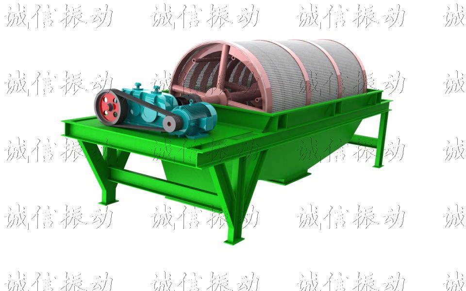 電動機經減速機與滾筒裝置通過聯軸器連接在一起,驅動滾筒繞其軸線轉動。當物料進入滾筒裝置后,由于滾筒裝置的轉動滾筒(可傾斜),使篩面上的物料翻轉與轉動,不合格物料經滾筒尾部的排料口排出,由于物料在滾筒內的翻轉,滾動,使卡在篩孔中的物料可被彈出,防止篩孔堵塞。