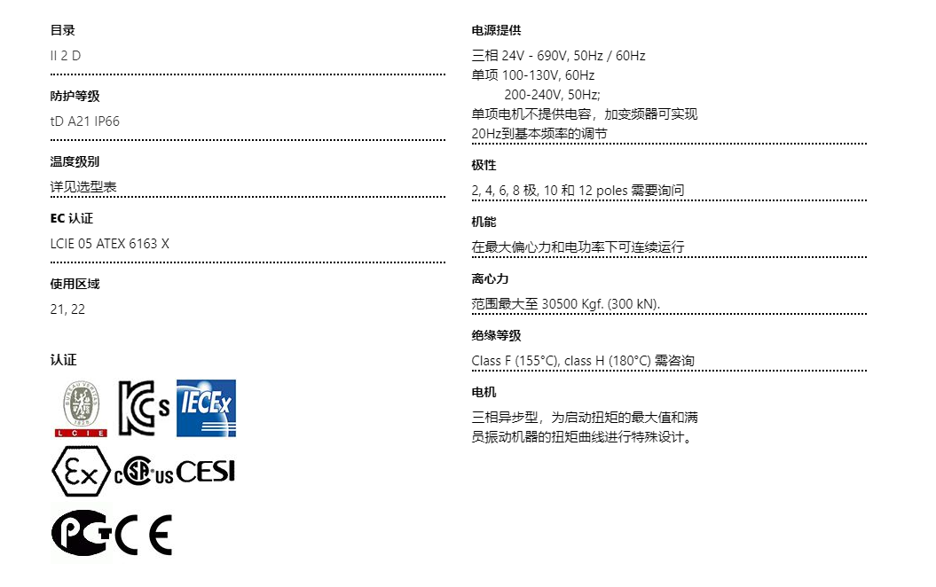 符合IEC和EN國(guó)際標(biāo)準(zhǔn)用于潛在爆炸性粉塵空氣中。特別情況下MVSI系列可用于區(qū)域21、22。