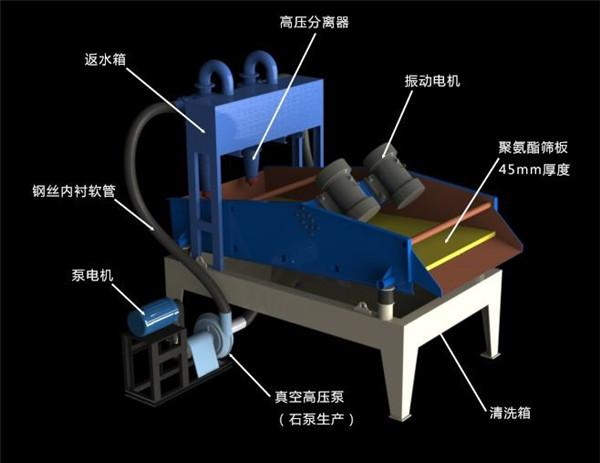 2、工作流程:洗砂機的成品物料直接進入脫水篩進行脫水,洗砂機排出的泥漿水則進入該設備清洗箱,經(jīng)由底部真空高壓泵抽至高壓分離器進行分J濃縮,細沙經(jīng)沉沙嘴進入脫水篩,其他廢水、泥、粉、雜質(zhì)等通過高壓分離器溢流口進入返水箱排出。