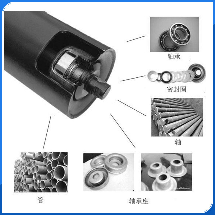 托輥通過輸送帶與托輥之間的摩擦力帶動托輥管體、軸承座及軸承外圈、密封圈做旋轉(zhuǎn)運動,與輸送帶并同其一起實現(xiàn)物流的傳輸。
