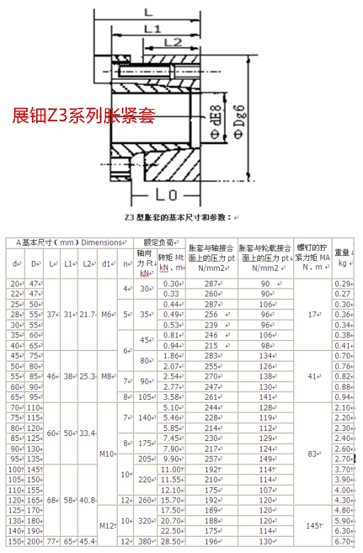 Z3型系列脹緊套型號如下:Z3-20×47、Z3-22×47、Z3-25×50、Z3-28×55、Z3-30×55、Z3-35×60、Z3-40×65、Z3-45×75、Z3-50×80、Z3-55×85、Z3-60×90、Z3-65×95、Z3-70×110、Z3-75×115、Z3-80×120、Z3-85×125、Z3-90×130、Z3-95×135、Z3-100 0145、Z3-105×150、Z3-110×155、Z3-120×165、Z3-125×170、Z3-130×180、Z3-140×190、Z3-150×200。注:Z3型脹緊聯(lián)結(jié)套螺釘?shù)臋C械性能等級為12.9級。