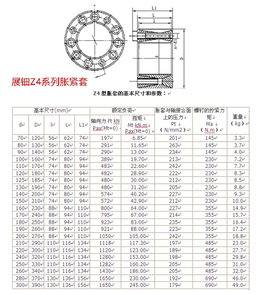 Z4型系列脹緊套型號如下:Z4-70×120、Z4-80×130、Z4-90×140、Z4-100×160、Z4-110×170、Z4-120×180、Z4-125×185、Z4-130×190、Z4-140×200、Z4-150×210、Z4-160×230、Z4-170×240、Z4-180×250、Z4-190×260、Z4-200×270、Z4-210×290、Z4-220×300、Z4-240×320、Z4-250×330、Z4-260×340、Z4-280×370、Z4-300×390、Z4-210×290、Z4-220×300、Z4-240×320、Z4-250×330、Z4-260×340、Z4-280×370、Z4-300×390。注:Z4型脹緊聯(lián)結(jié)套螺釘?shù)臋C械性能等級為12.9級。