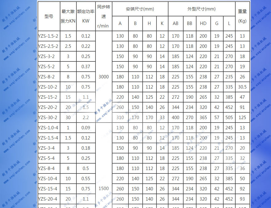 千振機(jī)械YZS振動電機(jī)技術(shù)參數(shù):