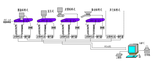 DCS自動集散式配料系統(tǒng)主要由JGC系列稱重給料機(jī)(配料秤)、稱重顯示控制器、可編程控制器、電氣控制系統(tǒng)、工業(yè)控制計算機(jī)和系統(tǒng)軟件等組成;該系統(tǒng)采用通用的工業(yè)計算機(jī)人機(jī)交互界面形式,它具有數(shù)據(jù)采集、控制、報警、圖形和數(shù)據(jù)顯示等功能。根據(jù)設(shè)定要求完成物料的配比控制以及生產(chǎn)過程中各種數(shù)據(jù)管理。