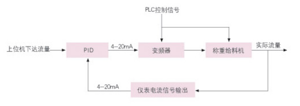 同時稱重儀表輸出一個與流量成正比的電流信號(4~20mADC或0~20mADC)給智能單回路調(diào)節(jié)器,智能單回路調(diào)節(jié)器根據(jù)用戶設(shè)定的PID參數(shù)及自整定方法運(yùn)算出控制電流(4~20mADC)給變頻調(diào)速電機(jī),從而調(diào)節(jié)皮帶運(yùn)行速度,達(dá)到穩(wěn)定控制給料量的目的。