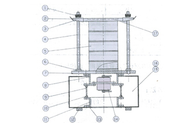 檢驗(yàn)篩結(jié)構(gòu)組成:1.圓手柄 2.緊固手柄 3.壓頭 4.立桿 5.篩具 6.螺母 7.托盤 8.振動(dòng)體 9.彈簧 10.彈簧座11.底筒 12.地腳13.殼體 14.振動(dòng)電機(jī) 15.繼電器 16.開關(guān) 17.蓋板