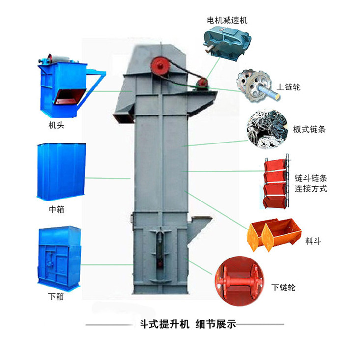 斗式提升機(jī)適用于垂直輸送松散密度1.5t/m3粉狀、粒狀、及小塊狀的磨吸性較小的散狀物料,如糧食、煤、水泥、碎礦石等,提升高度高,物料溫度不超過(guò)60℃
