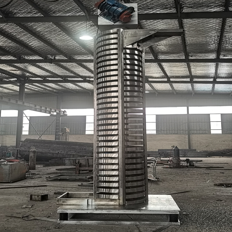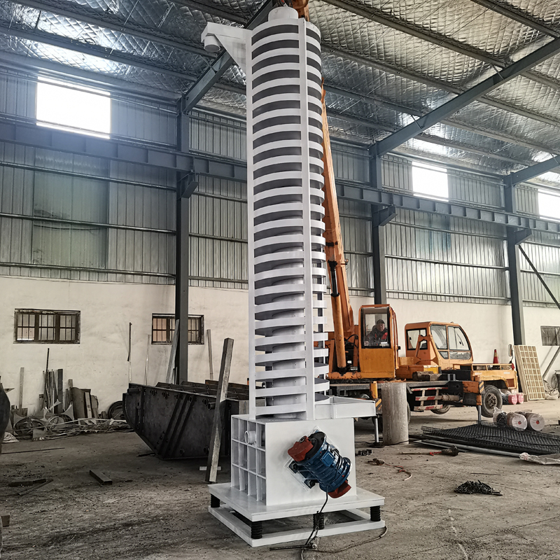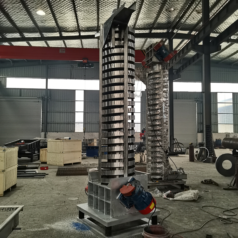垂直提升機(jī)的驅(qū)動(dòng)裝置振動(dòng)電機(jī)安裝在輸送塔下部,兩臺(tái)振動(dòng)電機(jī)對(duì)稱交叉安裝,輸送塔由管體和焊接在管體周圍的螺旋輸送槽組成,輸送塔座于減振裝置 上,減振裝置由底座和隔振彈簧組成。當(dāng)垂直提升機(jī)工作時(shí),根據(jù)雙振動(dòng)電機(jī)自同步原理,由振動(dòng)電機(jī)產(chǎn)生激振力,強(qiáng)迫整個(gè)輸送塔體作水平圓運(yùn)動(dòng)和向上垂直運(yùn)動(dòng) 的空間復(fù)合振動(dòng),螺旋槽內(nèi)的物料則受輸送槽的作用,作勻速拋擲圓運(yùn)動(dòng),沿輸送槽體向上運(yùn)動(dòng),從而完成物料的向上(或向下)輸送作業(yè),因此本設(shè)備也被成為振 動(dòng)垂直輸送機(jī)。