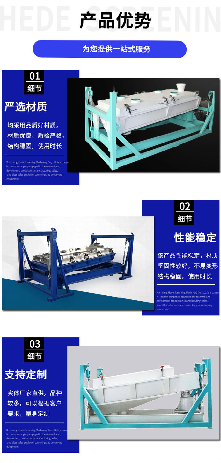 • 主營產(chǎn)品:三次元振動篩,超聲波振動篩,圓形搖擺篩,方形搖擺篩,概率篩,直線篩,平面回旋篩,臥式氣流篩,直排篩,過濾干燥一體機(jī),方形輸送機(jī),Z型轉(zhuǎn)斗式提升機(jī),垂直提升機(jī),螺旋輸送機(jī),真空上料機(jī)等