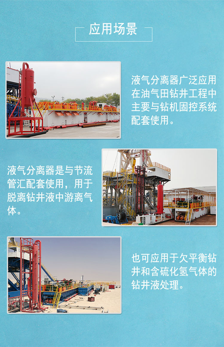 正道能源液氣分離器可用于油氣田鉆井固控系統(tǒng)中、欠平衡鉆井和含硫化氫氣體的鉆井液處理中等項(xiàng)目場(chǎng)景中。