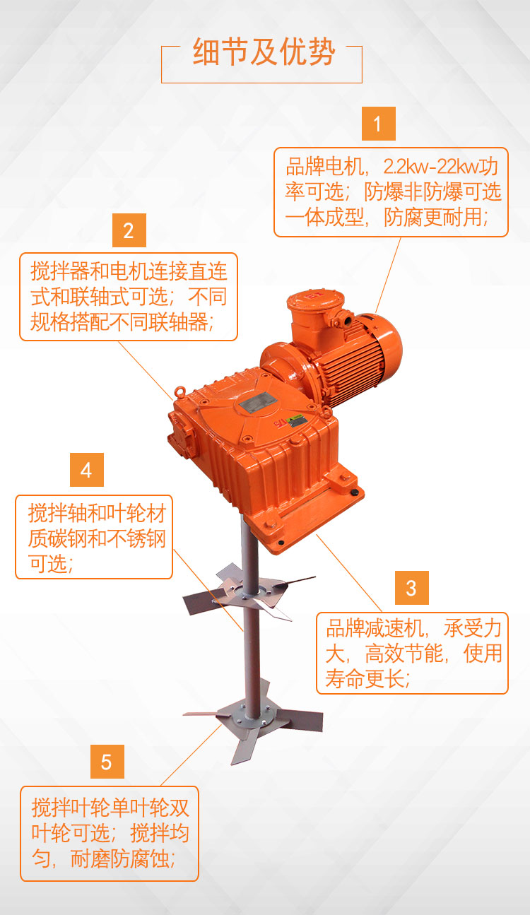 攪拌軸和葉輪材質(zhì)碳鋼和不銹鋼可選,葉輪單葉輪雙葉輪可選;攪拌均勻,耐磨防腐蝕;