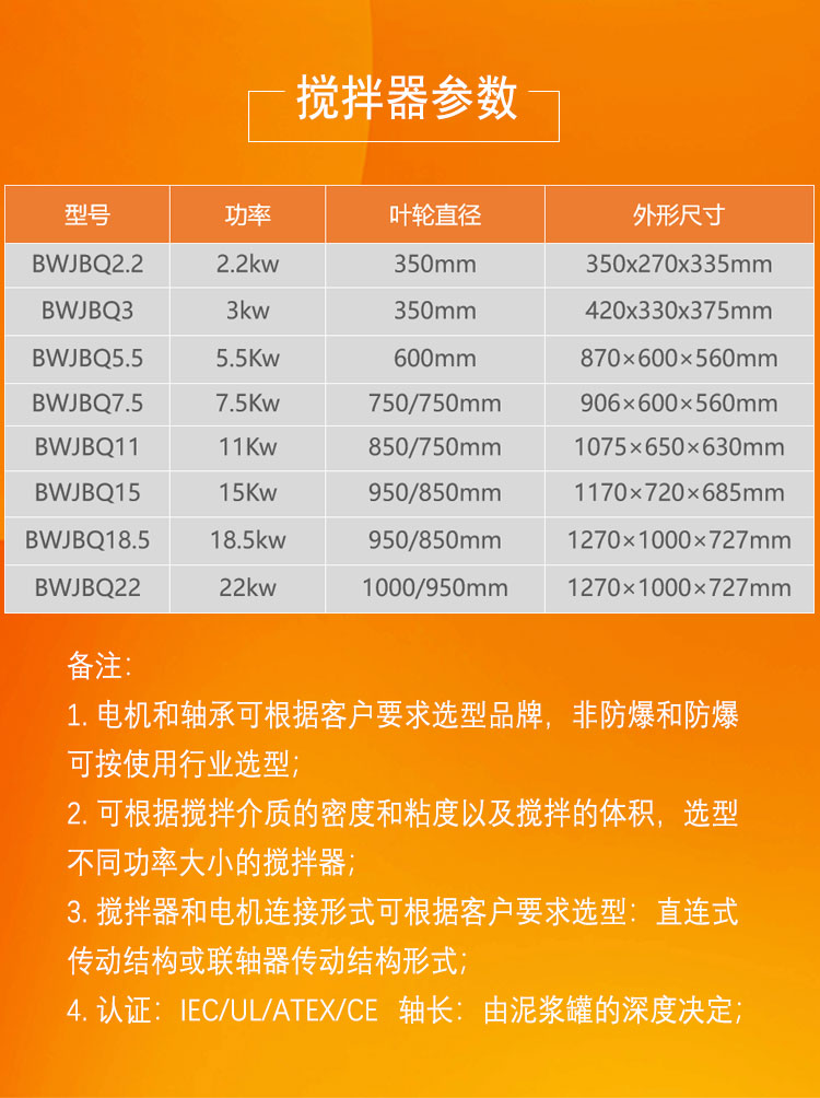 正道能源BWJBQ系列泥漿攪拌器型號(hào)包括:JBQ2.2, JBQ3, JBQ5.5, JBQ7.5, JBQ11, JBQ15, JBQ22等,減速機(jī)類型為蝸輪蝸桿和斜齒輪兩種,具體泥漿攪拌器參數(shù)規(guī)格參見下方技術(shù)參數(shù)表。