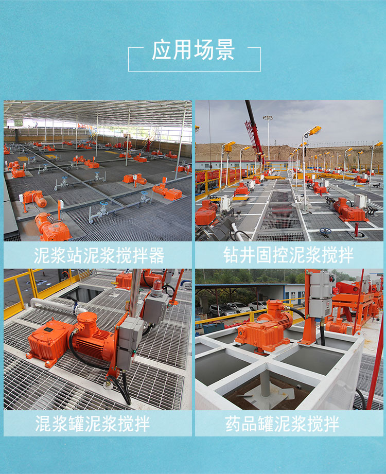 正道能源泥漿攪拌器應(yīng)用場(chǎng)景:泥漿攪拌器可用于泥漿站泥漿攪拌、鉆井固控泥漿攪拌、混漿罐泥漿攪拌、藥品罐泥漿攪拌等不同項(xiàng)目場(chǎng)景中。