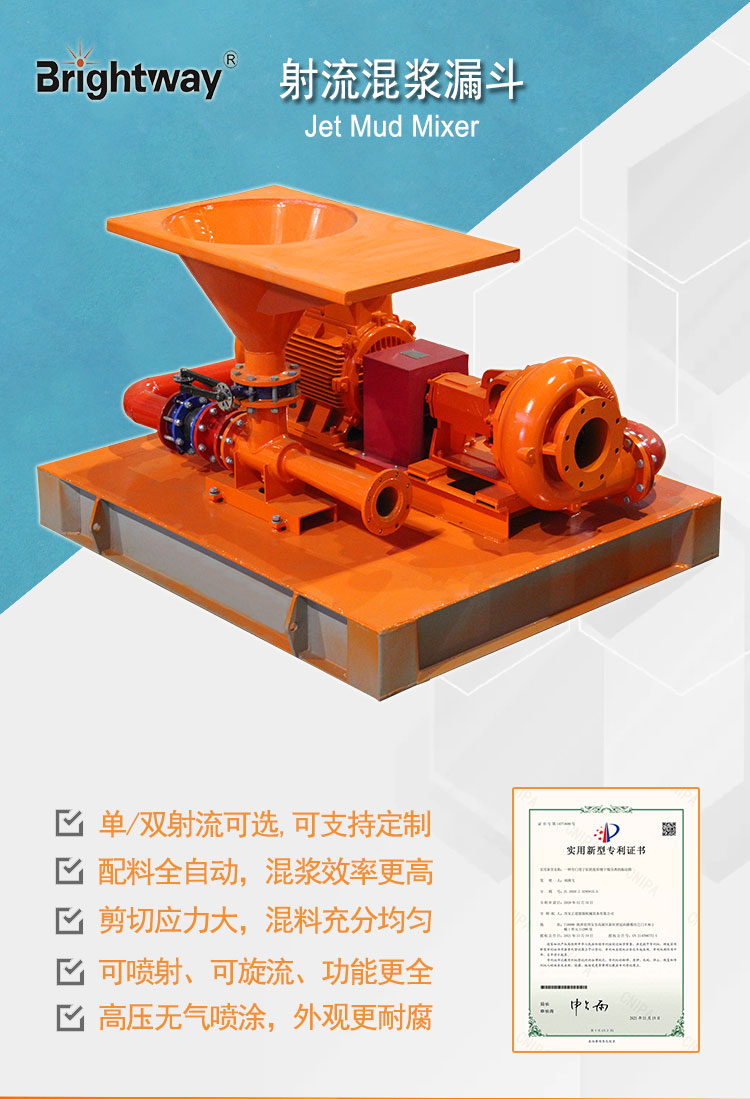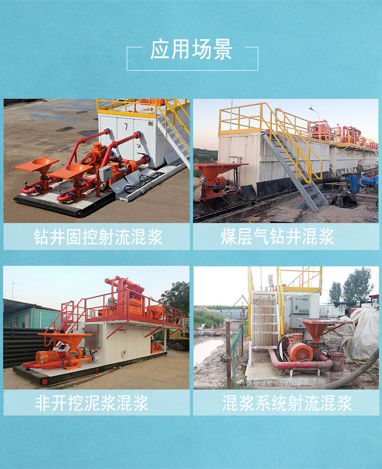 射流混漿裝置由一臺(tái)砂泵和一臺(tái)射流式混合漏斗用管匯閥門聯(lián)接安裝在一個(gè)底座上組成,射流混漿裝置主要被用來配制或增加鉆井液總量,改變鉆井液密度、粘度、失水,是加重鉆井液專用油田設(shè)備之一。鉆井泥漿處理過程中需要將鉆井液材料(膨潤(rùn)土,重晶石粉等)和相應(yīng)的化學(xué)添加劑(聚合物等)投入鉆井液循環(huán)罐中,射流混漿裝置起到剪切和混合大量塊狀化學(xué)藥劑,讓其充分分散和鉆井液均勻混合,以避免造成鉆井液材料和化學(xué)添加劑大量沉淀或團(tuán)聚。射流混合漏斗通常應(yīng)用到石油鉆井固控混漿射流,非開挖工程領(lǐng)域泥漿混合射流等。
