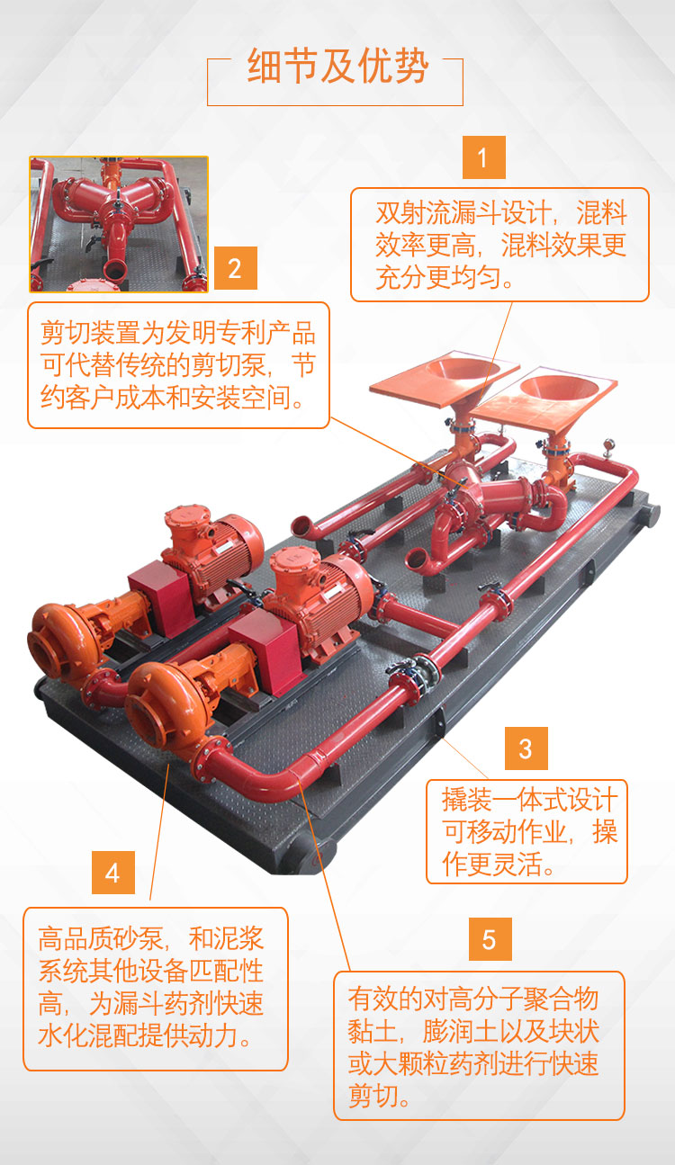優(yōu)質(zhì)文丘里管線,泥漿流速大,藥劑輸送快,不堵漏,混漿迅速。