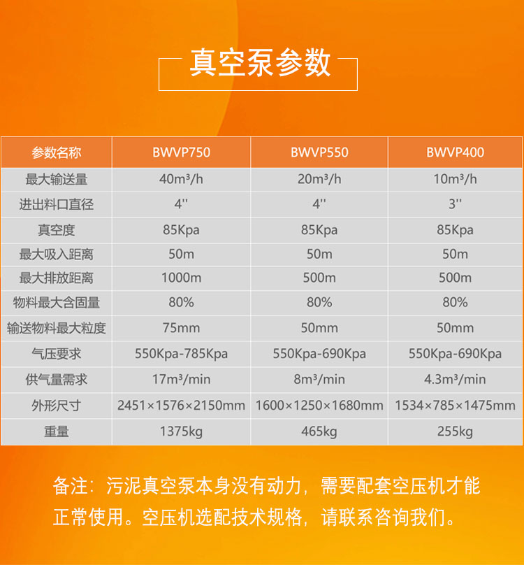 正道能源BWVP系列污泥真空泵有BWVP400型,BWVP550型,BWVP750型等三種類型,污泥真空泵選型有可移動便捷式和裝箱式兩種可選。污泥真空泵本身沒動力來源,需要配套相對應(yīng)的空壓機(jī),空壓機(jī)客戶可自備或選配。