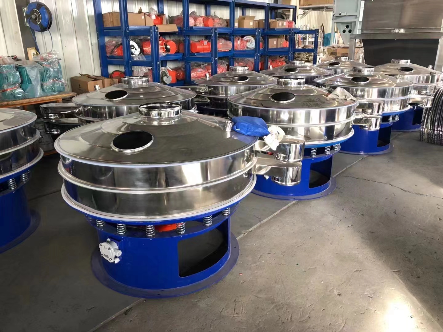 直排篩,占地面積小,輕便,振動電機兩臺,想比旋振篩,這個一層的篩子,料口直上直下就顯現(xiàn)的比較大,1米直徑的直排篩,出料口做起來也都60公分了,旋振篩和直線篩都沒有那么大的出料口。
