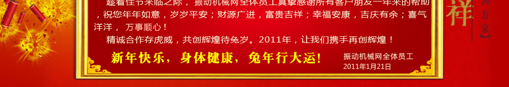 新鄉(xiāng)市宏達(dá)振動(dòng)設(shè)備有限責(zé)任公司:祝全國(guó)各族人民新年愉快。闔家歡樂! 在新的一年里里,身體健健康康,家庭和和美美,企業(yè)蒸蒸日上,生意紅火活活! 2011年期待與您合作!