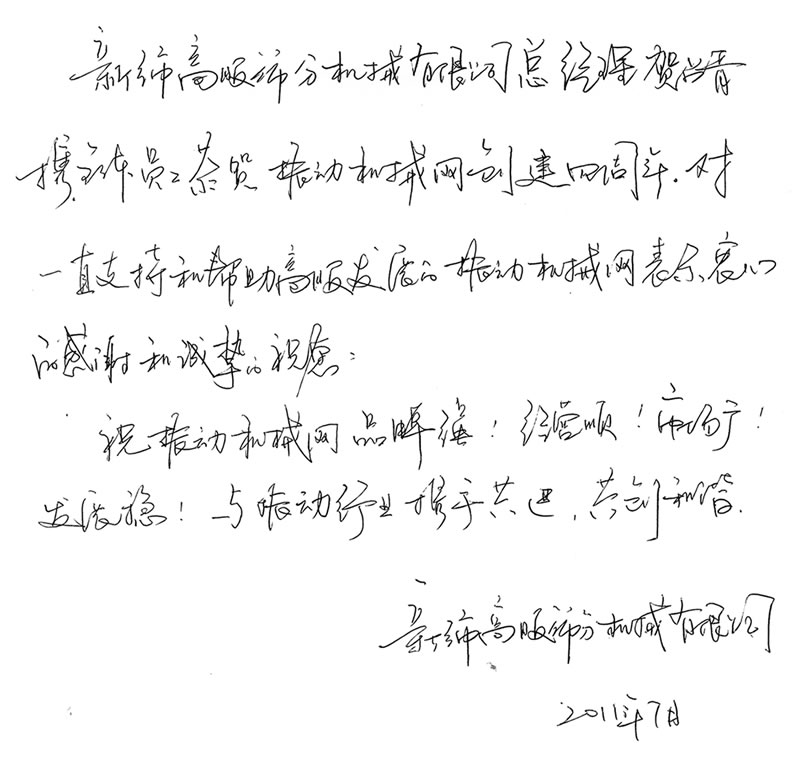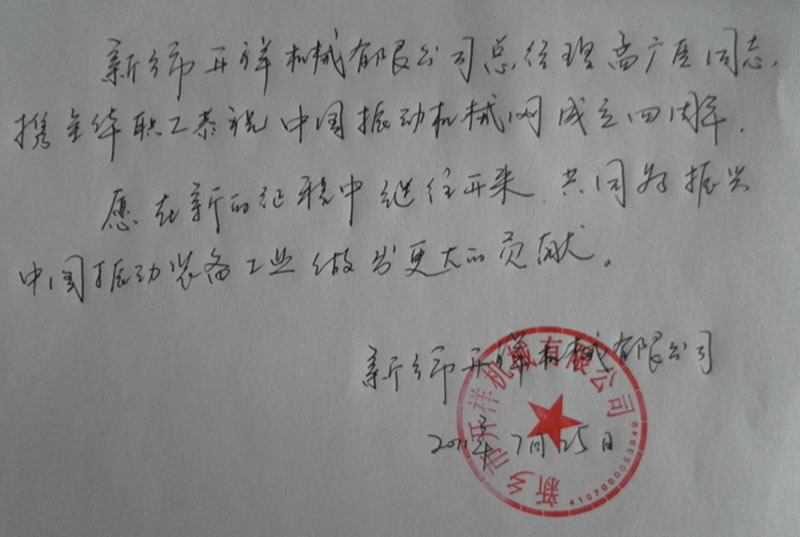愿在新的征程中繼往開來、共同為振興中國振動裝備工業(yè)做出更大的貢獻。--- 新鄉(xiāng)市開祥機械有限公司、2011年7月25日