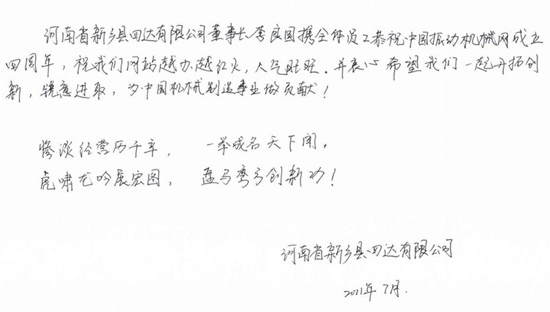 河南省新鄉(xiāng)縣四達有限公司董事長李良國攜全體員工恭祝中國振動機械網(wǎng)成立四周年,祝我們網(wǎng)站越辦越紅火,人氣旺。并衷心希望我們一起開拓創(chuàng)新,銳意進取,為中國機械制造事業(yè)做貢獻!