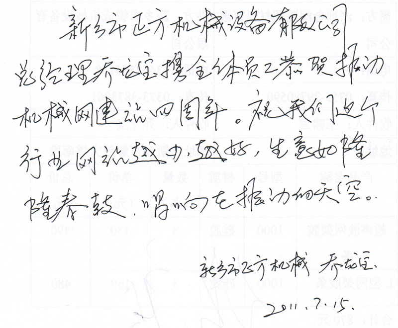 新鄉(xiāng)市正方機械設備有限公司總經(jīng)理喬龍寶攜全體員工恭賀振動機械網(wǎng)建站四周年。祝我們這個行業(yè)網(wǎng)站越辦越好,生意如隆隆鼓,唱響在振動的天空。---新鄉(xiāng)市正方機械、喬龍寶、2011年7月15日