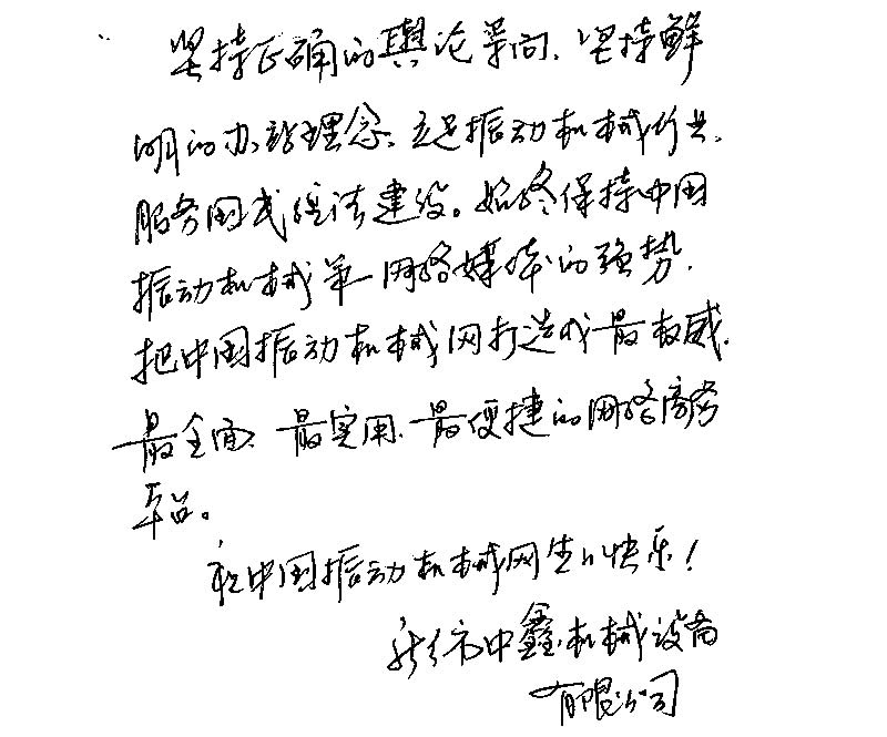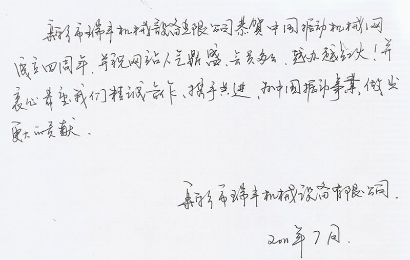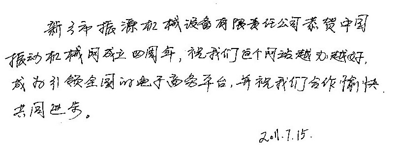 新鄉(xiāng)市振源機械設備有限責任公司恭賀中國振動機械網(wǎng)成立四周年,祝我們這個網(wǎng)站越辦越好,成為引領全國的電子商力平臺,并祝我們合作愉快、共同進步。---新鄉(xiāng)振源機械-張新鋒、2011年7月15日
