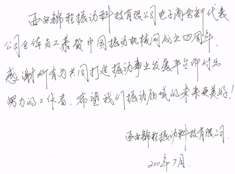 西安錦程振動科技有限公司電子商務部代表公司全體員工恭賀中國振動機械網(wǎng)成立四周年,感謝所有為共同打造振動事業(yè)發(fā)展平臺而付出努力的工作者,希望我們振動領域的未來更美好!----西安錦程振動科技有限公司、2011年7月