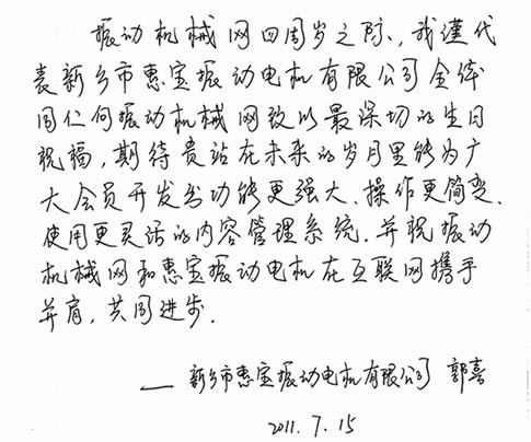 振動機械網(wǎng)四周歲之際,我謹代表新鄉(xiāng)市惠寶振動電機有限公司全體同仁向振動機械網(wǎng)致以最深切的生日祝福,期待貴站在未來的歲月里能為廣大會員開發(fā)出功能更強大、操作更簡變、使用更靈活的內(nèi)容管理系統(tǒng),并祝振動機械網(wǎng)和惠寶振動電機在互聯(lián)網(wǎng)攜手并肩,共同進步。---新鄉(xiāng)市惠寶振動電機有限公司、郭喜、2011年7月15日