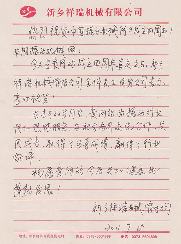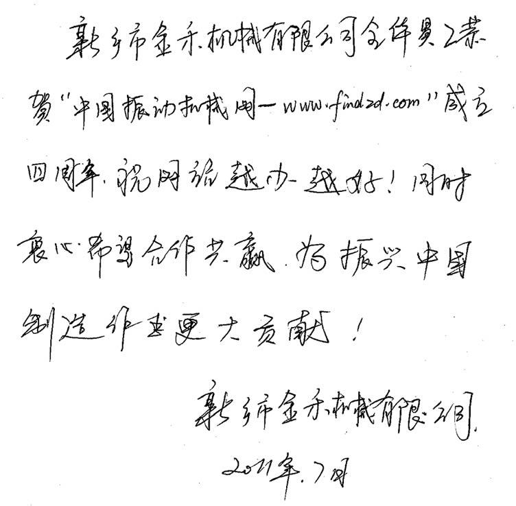 新鄉(xiāng)市金禾機械有限公司全體員工恭賀"中國振動機械網(wǎng)-www.clwzyc.cn"成立四周年,祝網(wǎng)站越辦越好!同時衷心希望合作共羸,為振興中國制造作出更大貢獻!---新鄉(xiāng)市金禾機械有限公司、2011年7月