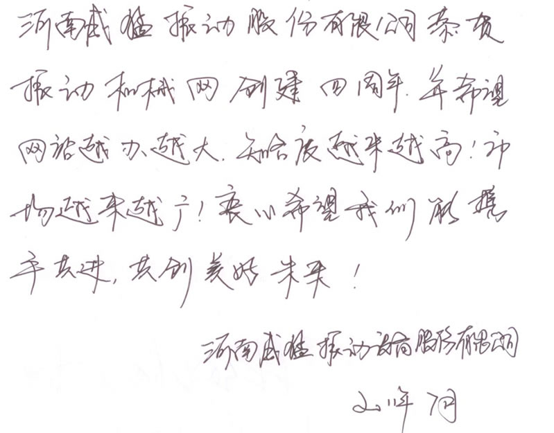 河南威猛振動設備股份有限公司恭祝振動機械網(wǎng)創(chuàng)建四周年,并希望網(wǎng)站越辦越大,知名度越來越高!市場越來越廣!衷心希望我們能攜手共進,共創(chuàng)美好未來?。幽贤驼駝釉O備股份有限公司、2011年7月15日