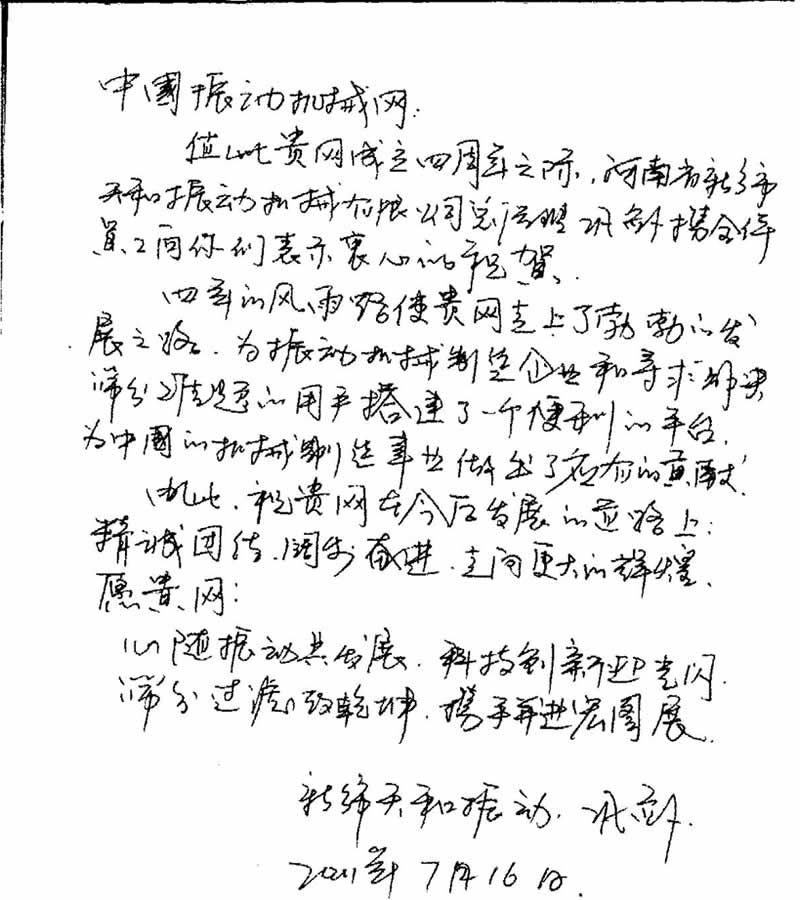 新鄉(xiāng)市金禾機械有限公司全體員工恭賀"中國振動機械網(wǎng)-www.clwzyc.cn"成立四周年,祝網(wǎng)站越辦越好!同時衷心希望合作共羸,為振興中國制造作出更大貢獻?。锣l(xiāng)市金禾機械有限公司、2011年7月