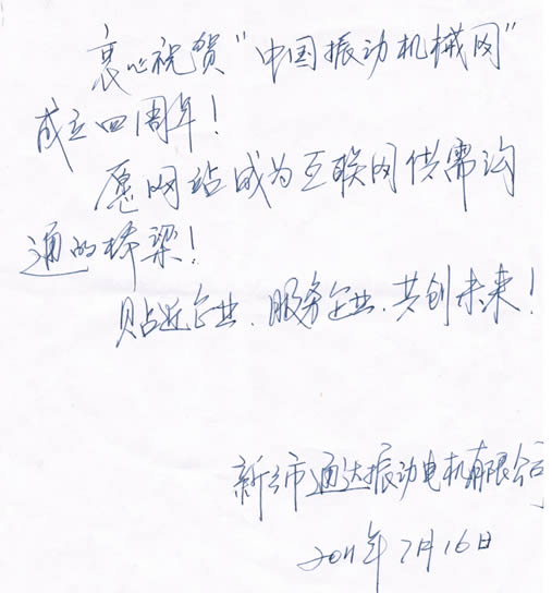 衷心祝賀"中國振動機械網(wǎng)"成立四周年!愿網(wǎng)站成為互聯(lián)網(wǎng)供需溝通的橋梁!帖近企業(yè)、服務企業(yè)、共創(chuàng)未來!---新鄉(xiāng)市通達振動電機有限公司、2011年7月16日