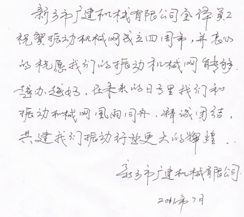 新鄉(xiāng)市廣建機械有限公司全體員工祝賀振動機械網(wǎng)成立四周年,并衷心的祝愿我們的振動機械網(wǎng)能夠越辦越好,在未來的日子里我們和振動機械網(wǎng)風雨同舟、精誠團結,共建我們振動行業(yè)更大的輝煌。---新鄉(xiāng)市廣建機械有限公司 2011年7月